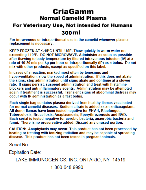 CriaGamm is for intravenous and intraperitoneal use in the treatment of fluid and protein loss in the camelid neonate. For the average cria, a dose of 1 unit is suggested. This is well tolerated by the cria and can be administered IV in 15-30 minutes.